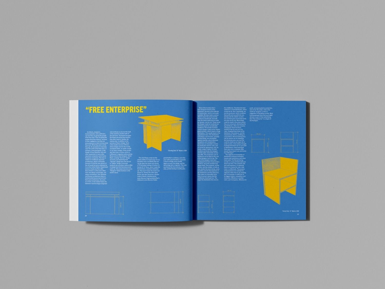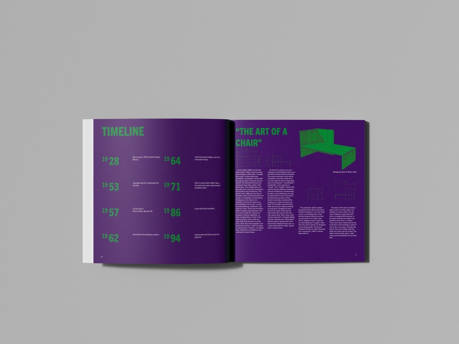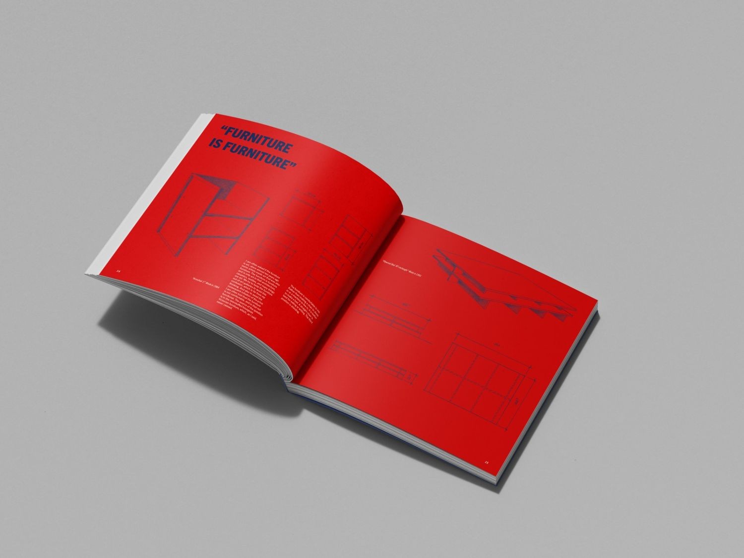 This book started with Donald Judd’s line, “It’s hard to find a good lamp,” which felt bold enough to carry the whole cover on its own. Inside, I used strong color blocks, clean grids, and technical drawings of the furniture to keep everything clear and structured.