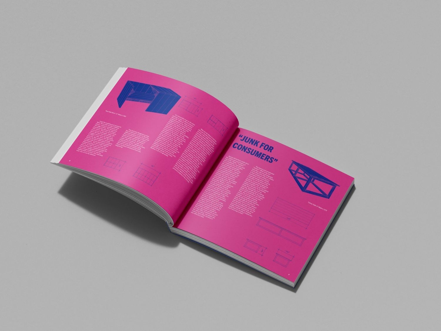 This book started with Donald Judd’s line, “It’s hard to find a good lamp,” which felt bold enough to carry the whole cover on its own. I leaned into bright, high-contrast colors and big, simple type to make it feel direct and confident. Inside, I used strong color blocks, clean grids, and technical drawings of the furniture to keep everything clear and structured.